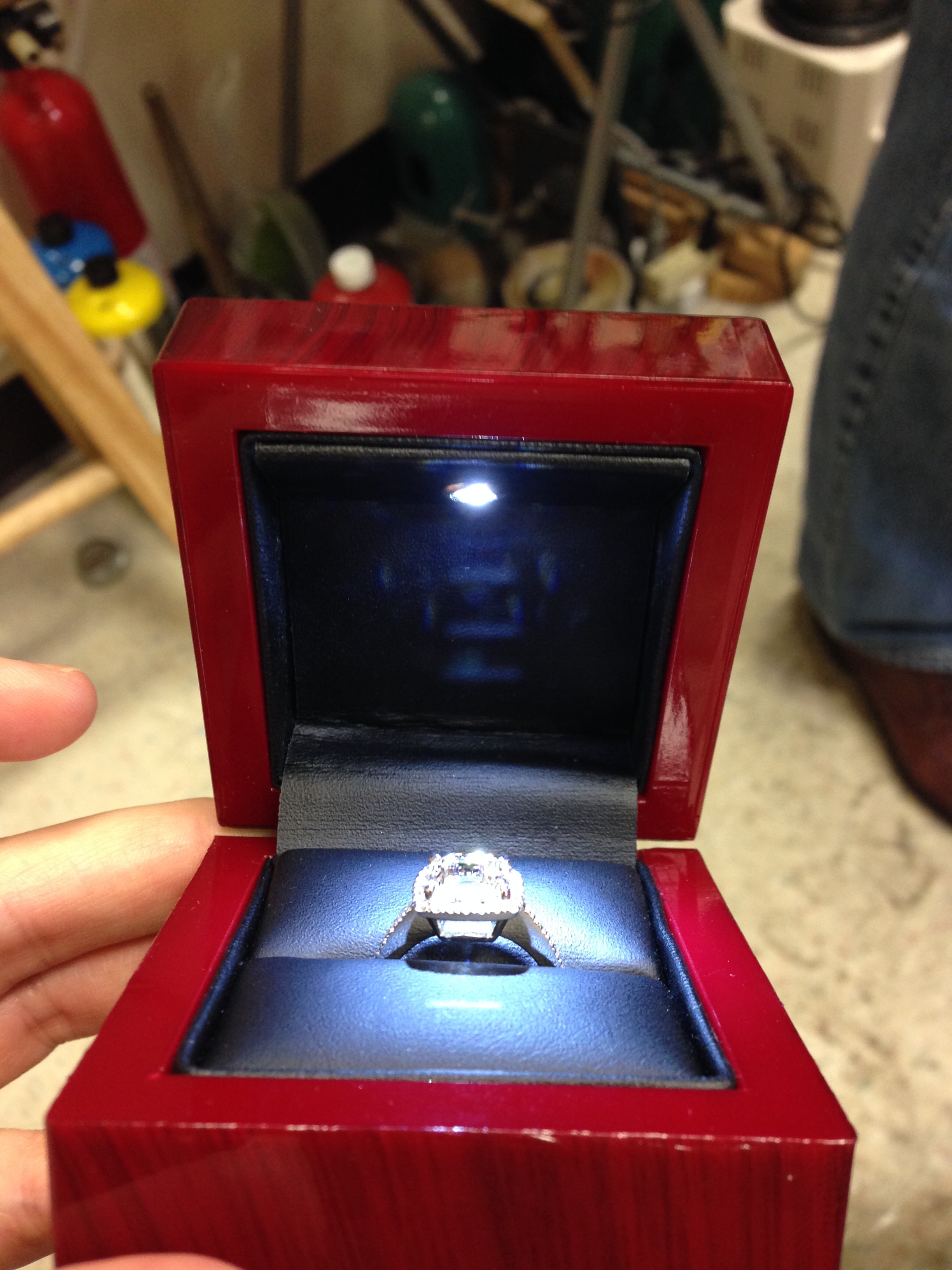 Added bonus to this particular project: I found THE GREATEST RING BOX EVER to present it! This baller box features a cherry-wood finish with a built-in LED light in the lid that illuminates the ring upon opening… I mean, come on. Why haven’t we been putting lights in all our boxes??