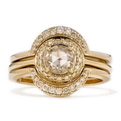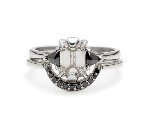 I also really appreciate the way she crafts her accompanying wedding bands. The presiding trend of yesteryear was to sell the engagement ring and wedding band as a set, and have the wedding band hug the engagement ring perfectly. Still a lovely look when executed well, but it is definitely no longer the requirement. Anna’s wedding bands follow a basic arc, allowing them to accommodate a number of different engagement rings. I particularly like that this also allows for a stacked appearance which is delightfully on-trend at the moment.