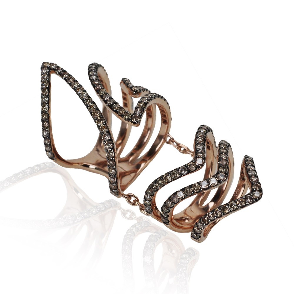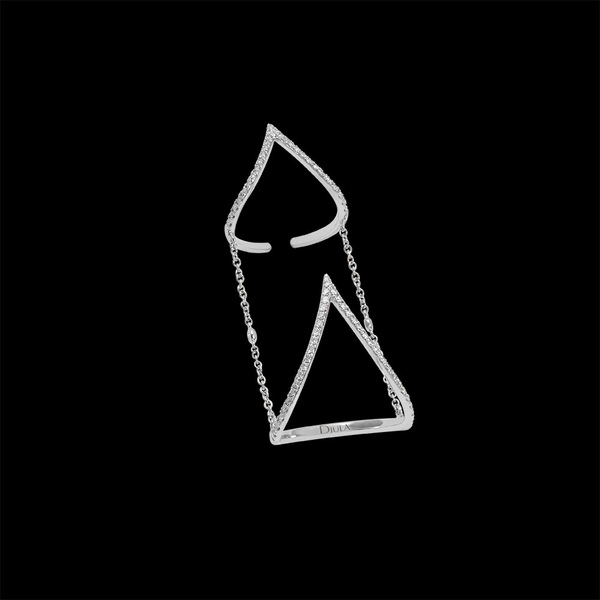 Jewelry trends are fascinating to watch because they almost always start with the cheap stuff, the fashion jewelry made out of plated bronze and cheap stones etc., before fine jewelry takes note of the trend’s staying power and begins to incorporate the style elements into their gold and diamond offerings. As I was perusing some of my favorite designers to select my next Sunday Spotlight feature, I noticed that chains, especially over the knuckles to connect two or three separate rings, are popping up in the good stuff. I think I’m in favor – I like the idea of adornment on as much of the finger real estate as possible, without resorting to creepy full finger armor. Check out a few of these designs from Djula and Etho, currently on offer at Fragments: